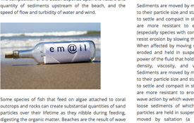 The composition of the beach depends upon the nature and quantity of sediments upstream of the beach, and the speed of flow and turbidity of water and wind. Sediments are moved by moving water and wind according to their particle size and state of compaction. Sediments are moved by moving water and wind according to their particle size and state of compaction. Alternatively, sand may be moved by saltation (a bouncing movement of large particles). Beaches are the result of wave action by which waves or currents move sand or other loose sediments of which the beach is made as these particles are held in suspension. Alternatively, sand may be moved by saltation (a bouncing movement of large particles). Beach materials come from erosion of rocks offshore, as well as from headland erosion and slumping producing deposits of scree. A coral reef offshore is a significant source of sand particles. Some species of fish that feed on algae attached to coral outcrops and rocks can create substantial quantities of sand particles over their lifetime as they nibble during feeding, digesting the organic matter. The composition of the beach depends upon the nature and quantity of sediments upstream of the beach, and the speed of flow and turbidity of water and wind.